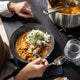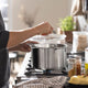 This stainless steel pot has a spout to make pouring and draining liquids easier and a heat resistant glass lid with a built in strainer. Perfect for when you are boiling pasta or making soup.