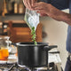 This pot makes it easier for you to fix dinner. Sol-gel ceramic non-stick coating, lightweight design and a lid with small holes for pouring water are helpful features. It works well on induction hobs too.