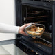 - The food container is made of oven-safe glass and can be used as an oven/serving dish.