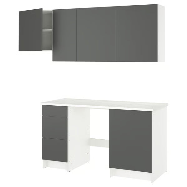 - Dark grey fronts combined with a white marble effect worktop brings a modern air to your kitchen and makes it feel warm and inviting.
