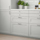 The solid wood frame with bevelled edges and inset veneer panel give LERHYTTAN kitchen fronts a classic, traditional look. The light grey finish creates a cosy kitchen with timeless feel.