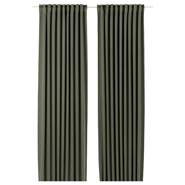 MAJGULL block-out curtains in dark green have a butter-soft texture that feels warm and chic. The pleats fall beautifully and the fabric gives total privacy. Multi-way header for different hanging options.