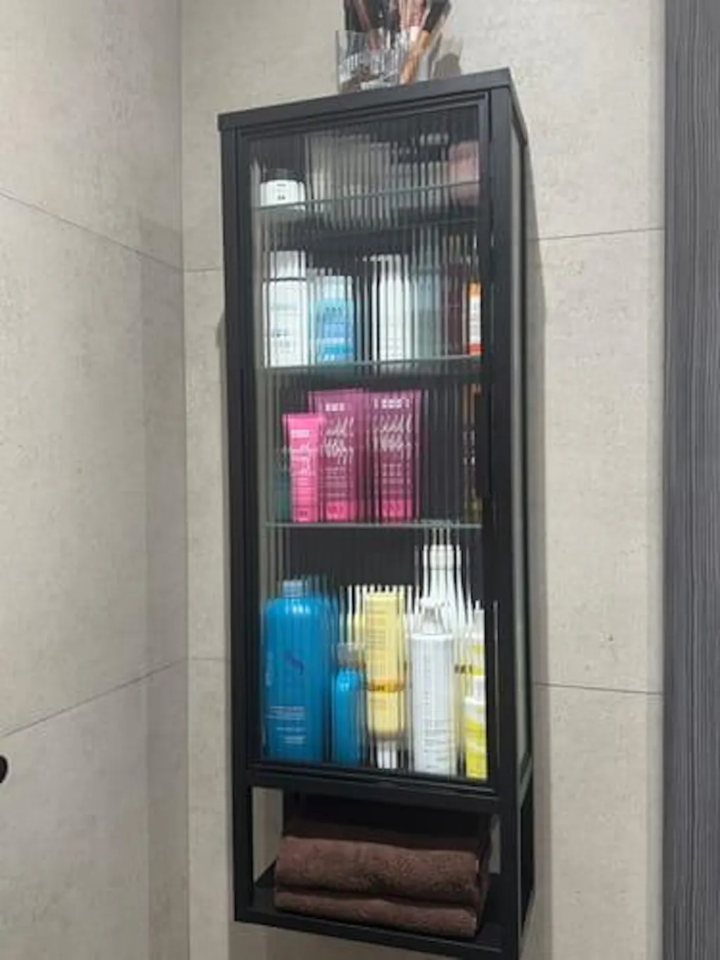 - The reeded glass on 3 sides allows light to sprinkle through while preventing curious eyes from looking in the cabinet.