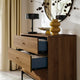 • The sense of quality is enhanced by careful details like the knobs with a brass look, the deep-blue interior of the drawers and the black metal legs that provide a slightly elevated and airy appearance.