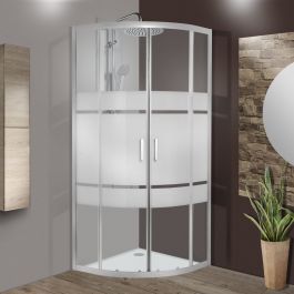 Semicircular sliding shower enclosure Sinque 80 x 80 cm, H 190 cm tempered glass, 5 mm thick screen-printed silverSemi-circular shower enclosure for corner installation. Fit 78-80 cm, with sliding opening. Sinque corner shower box features profiles with essential design and tempered glass doors (5 mm thick) and matte silver aluminum profile. Ideal for both small and medium spaces.