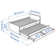 Length: 206 cmWidth: 96 cmHeadboard height: 78 cmFootboard height: 57 cmMattress width: 90 cmMattress length: 200 cmDrawer width (internal): 90 cmDrawer depth (internal): 57 cmMax weight/each bed: 100 kgBed width: 189 cmMax mattress thickness lower bed: 10 cm