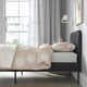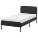 SLATTUM bed frame has soft upholstery and a padded headboard that complete the stylish and simple lines. Easy to like – and convenient to bring home thanks to the whole frame coming in a single package.