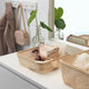 This slightly taller box in woven bamboo lets you glimpse what’s inside. The size and shape make this a decorative storage for things you want to keep close at hand but not always visible.