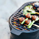 - Cast iron is a durable material and helps spread the heat evenly throughout the grill.
