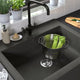 This sink with apron front in dark grey quartz composite offers a rebellious farmhouse appeal. The deep one-bowl design makes it easier to clean bigger pots and pans without splashing water on the floor.
