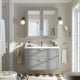 • A mirror above the wash-basin eases morning routines while making your bathroom feel bigger and brighter. This cabinet with shelves puts bottles, jars and things often used within easy reach.